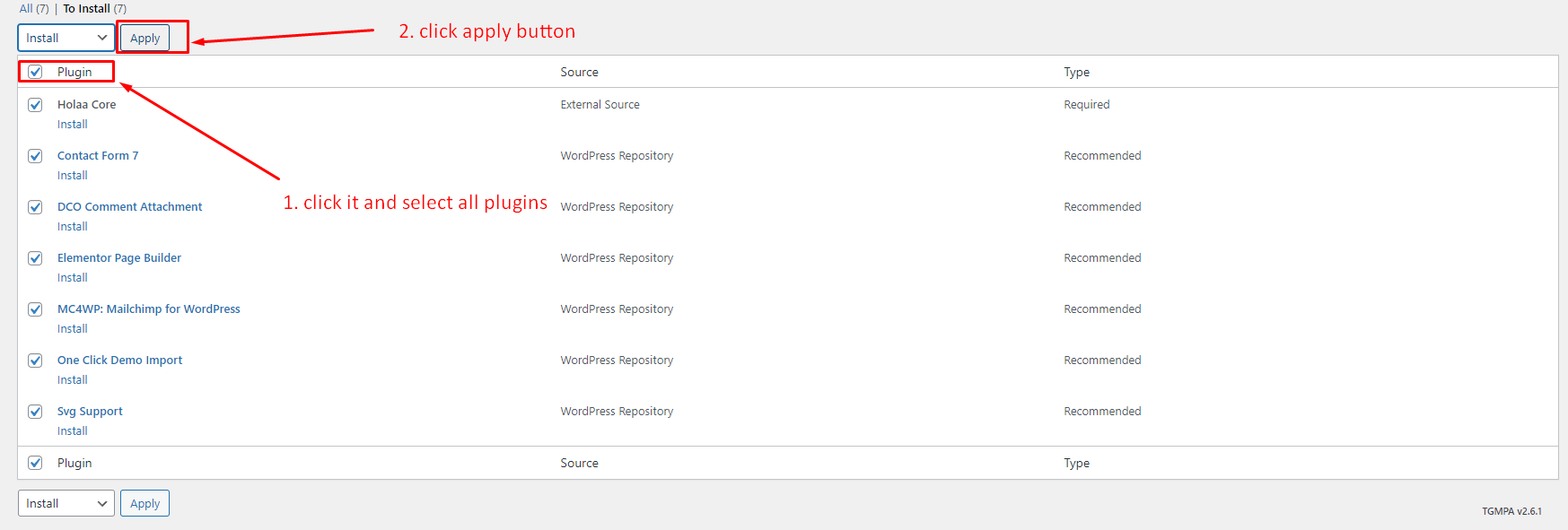 Select all required plugin, From the top dropdown menu select Install and click Apply.