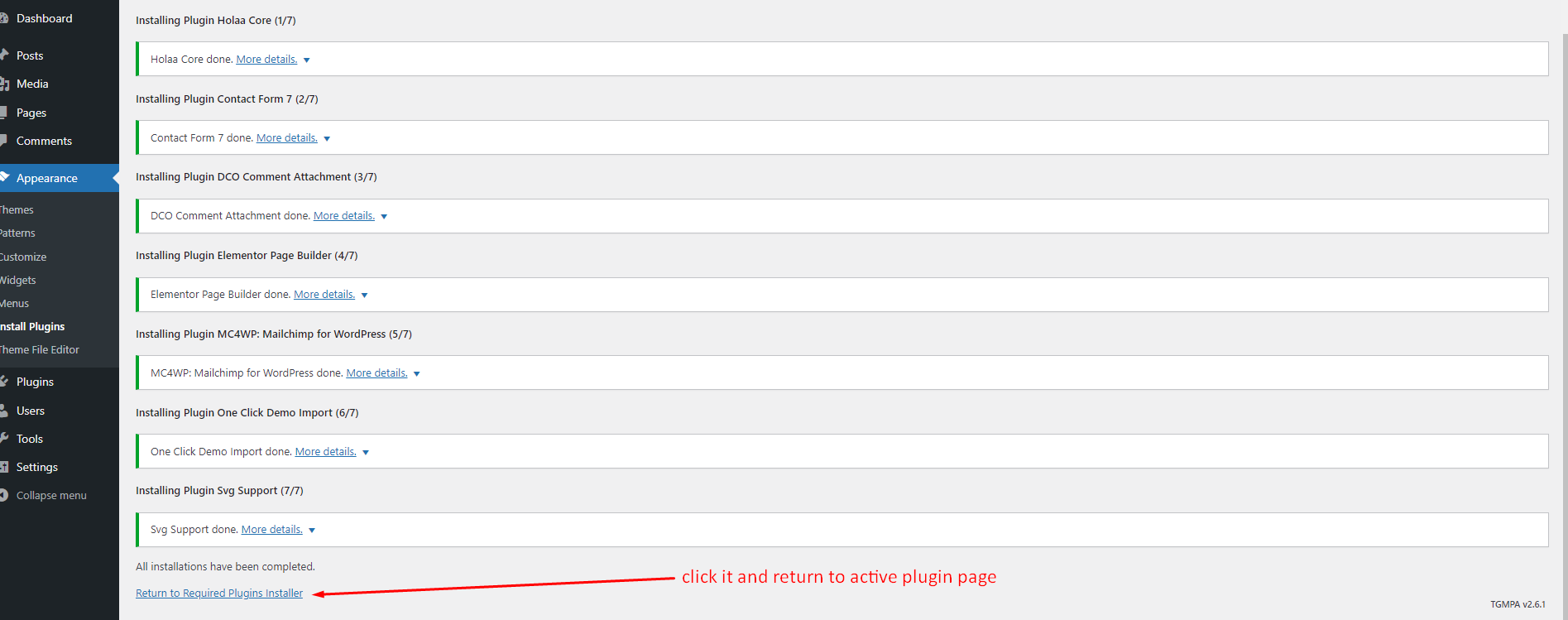 After Install all plugins sucessfully click Return to Required Plugins Installer.