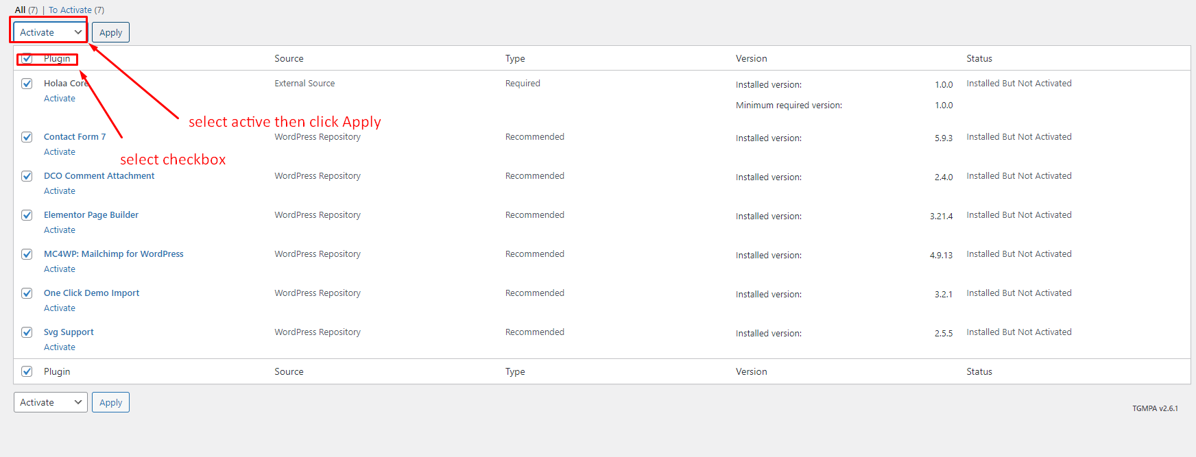 Select all required plugin, From the top dropdown menu select Activete and click Apply.