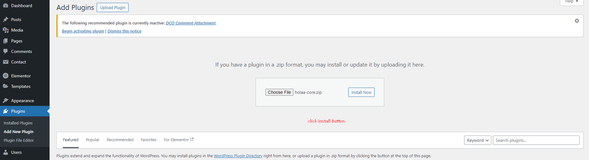 Click Choose File and select holaa-core.zip file.