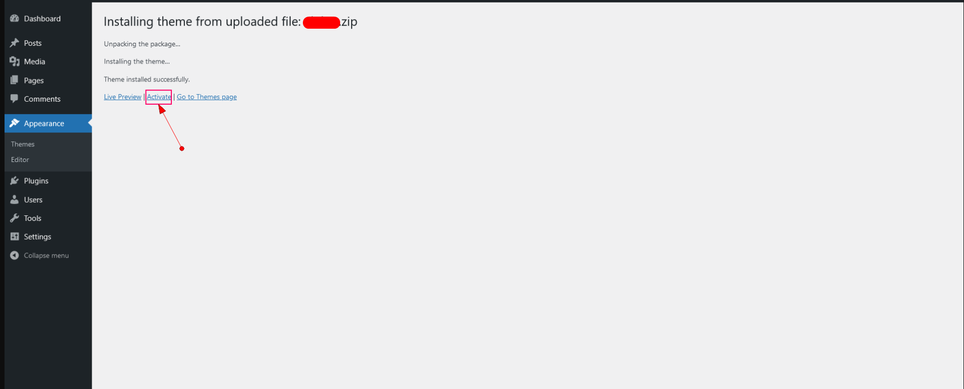 • After done installing, click Activate the theme