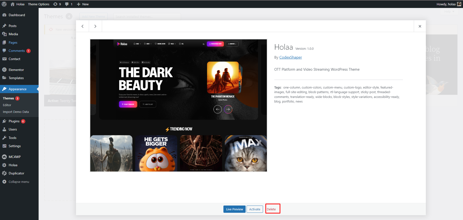 Thank you for purchasing Holaa Video Streaming & OTT Platform WordPress + RTL Theme If you have any questions that are beyond the scope of this help file, please feel free to email, or put a ticket at Support Center.